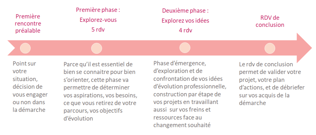 Une démarche sur 3 à 6 mois pour déterminer vos projets d’évolution professionnelle ou de réorientation. Au fil des entretiens, vous travaillez d’abord à explorer vos envies, vos aspirations, vos objectifs pour la suite, puis vous dessinerez progressivement les orientations possibles. Vous aboutirez à un projet spécifique ou à des options possibles dont vous aurez identifié les conditions de réalisation.